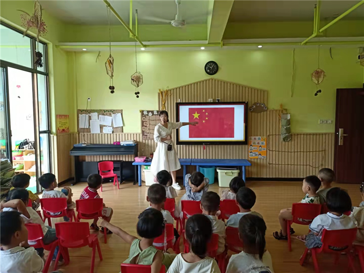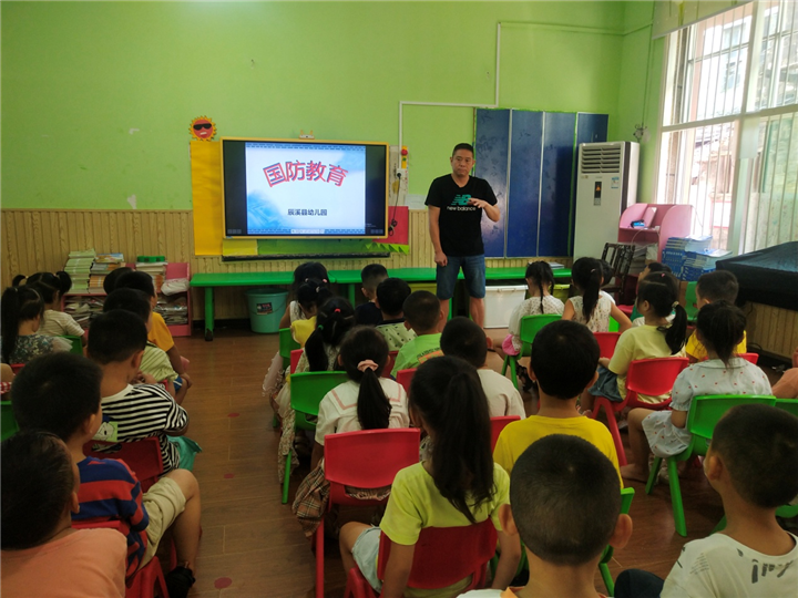 各班老师将知识性和趣味性有机结合,采用形象直观、生动活泼的形式,教孩子认识国旗、国徽、党旗、军旗,深入了解七一、八一、十一等纪念日的来历。同时还为孩子们讲述战斗英雄故事、观看国防动画片、欣赏国防绘画作品,从小培养幼儿良好的品质和社会责任感。